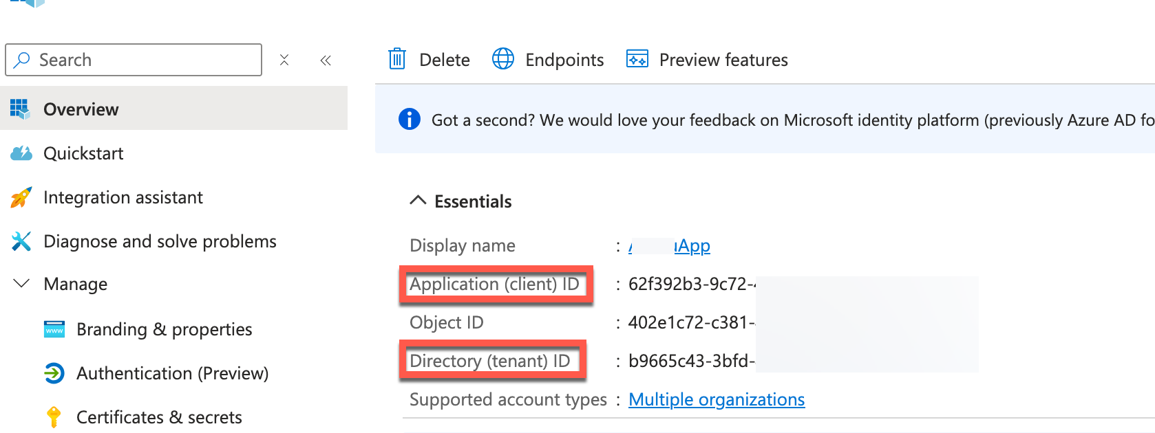 From the app overview page, copy the Application (client) ID and Directory (tenant) ID.
