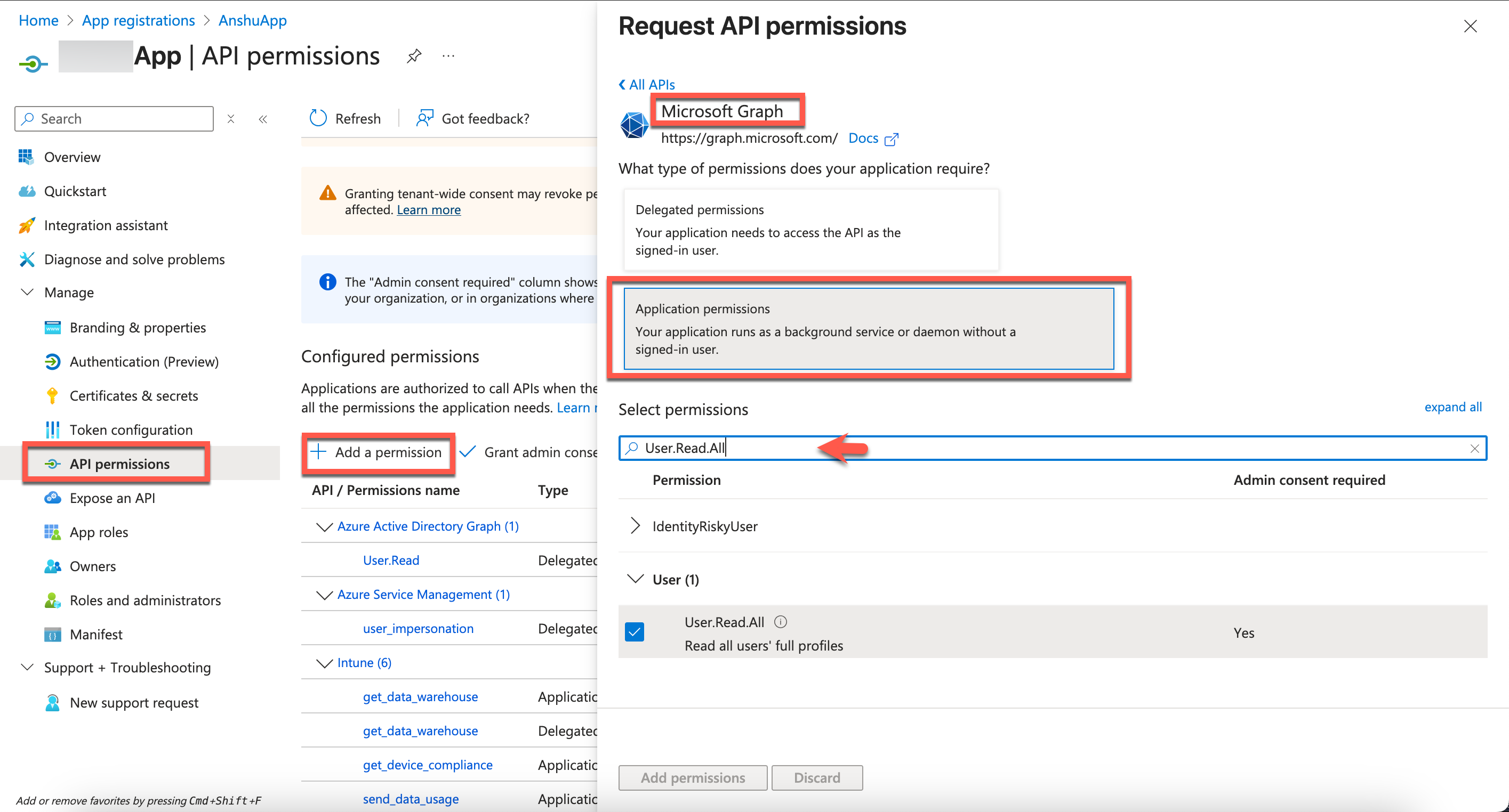 Select Microsoft Graph → Application permissions.
