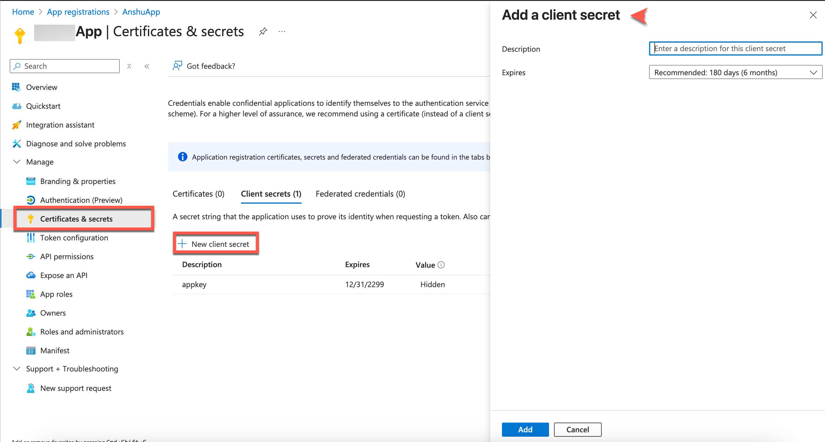 Click Add, then copy the Client Secret Value immediately. This value is visible only once at creation; store it securely.