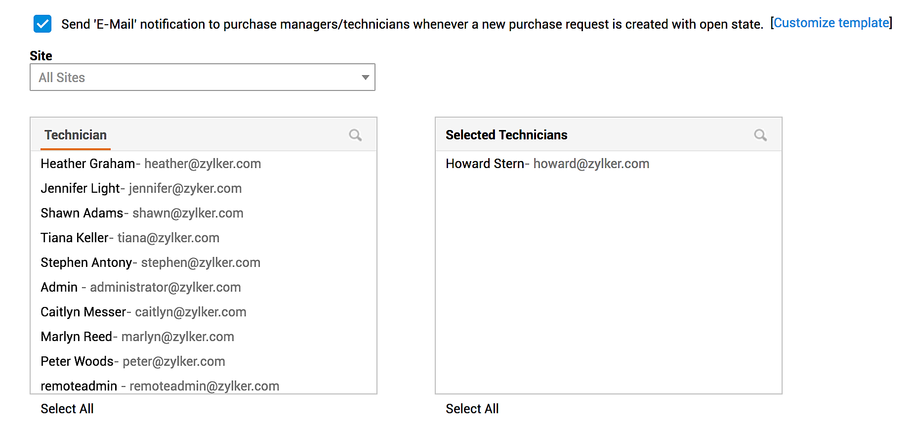 - Select the Send email notification to technicians… check box. Use Customize Template to modify the notification message.