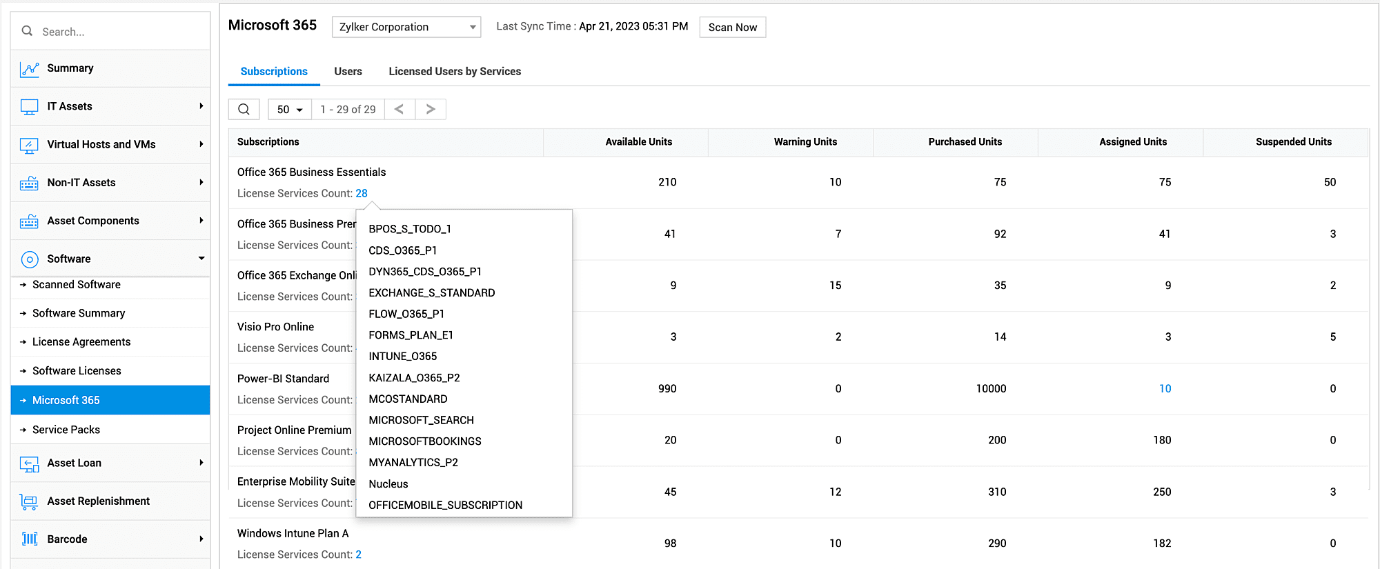 The Subscription tab within Software > Microsoft 365 shows the different applications and licenses available to users.